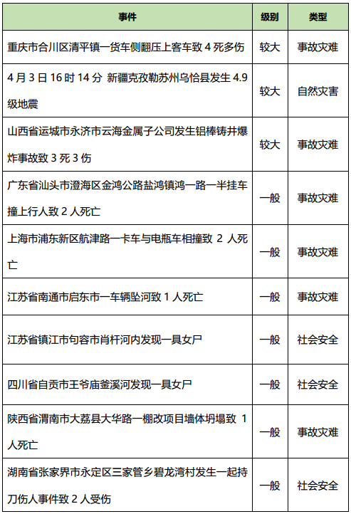 本期突发事件涉及到地震、火灾、社会安全、交通事故等。共造成至少31人死亡68人受伤。其中发生较大事故3起,一般事故213起。